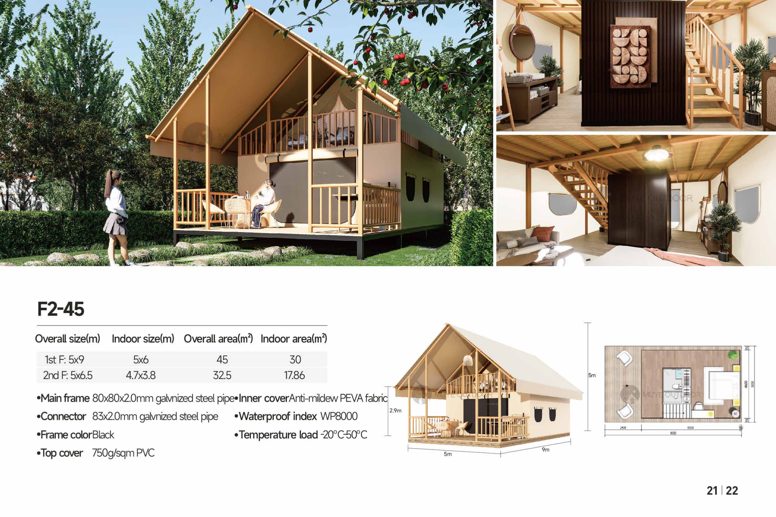 The highly attractive exterior design meets people's needs for a unique, stylish appearance, while the solid wood structure represents quality and sustainability, retaining the beauty of wood and providing a comfortable living environment. Duplex Countryside-Style Tent,Beautiful solid wood construction is not only a living space, but also a return to nature attitude towards life.